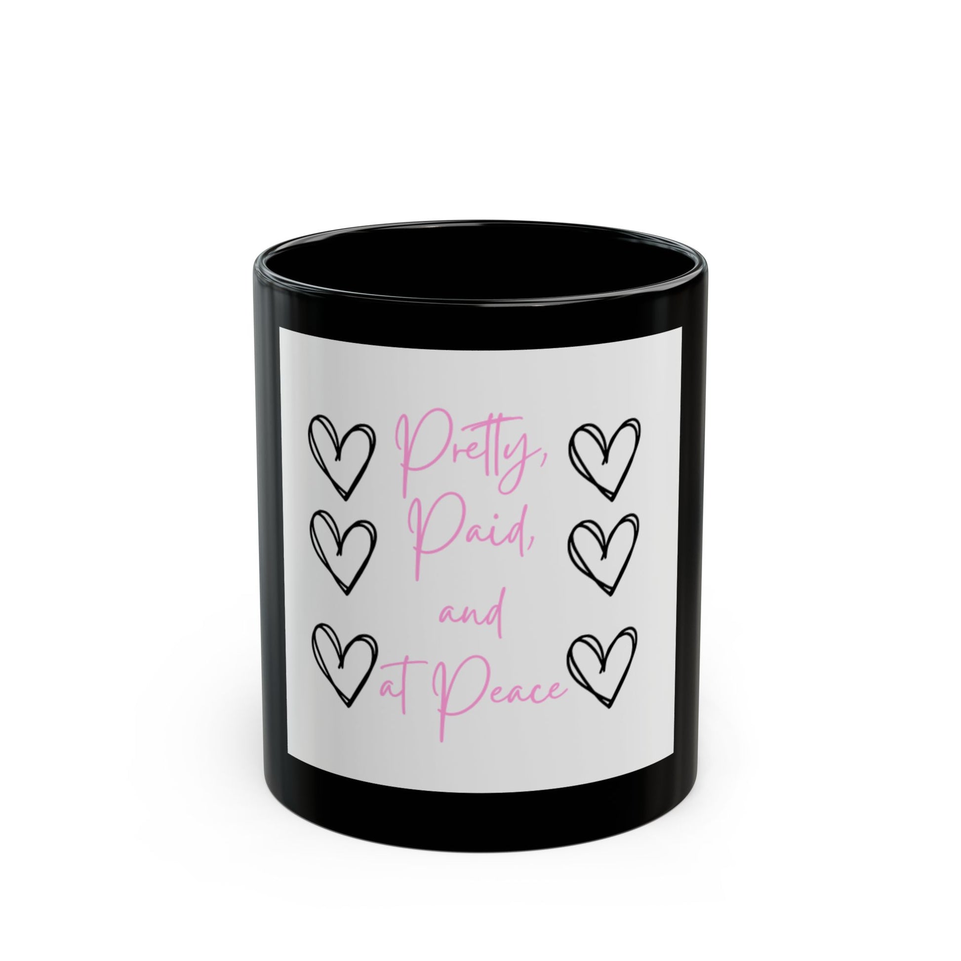 Start your day with a touch of inspiration with this stylish black mug. Perfect for both coffee lovers and tea enthusiasts, its sleek design and vibrant printing make every sip a delightful experience. Made from high-quality glossy ceramic, this mug is not only beautiful but also practical—it's microwave and dishwasher safe! Enjoy your favorite hot beverages at home or in the office while showcasing your unique personality. This mug is an excellent gift for friends, family, or coworkers who appreciate thoughtful and stylish drinkware. Ideal for holidays such as Christmas, birthdays, or simply as a treat for yourself, it's a reminder to stay 'Pretty, Paid, and at Peace' throughout your day!